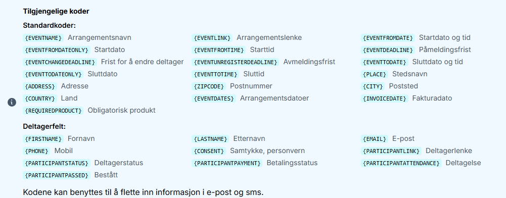 Du kan bruke flettekoder i bekreftelser, kursbevis, e-post og sms påminnelser.