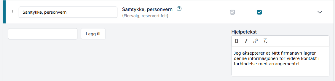 - Systemadministrator kan legge inn personvernerklæring som vil vises i samtykkefeltet i alle påmeldingsskjemaer.