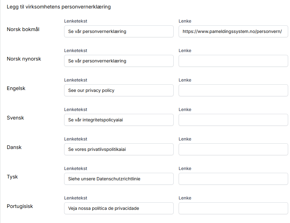 - Legg til en egen tekst for personvernerklæring, samt en link eller PDF som viser til deres personvernerklæring.
