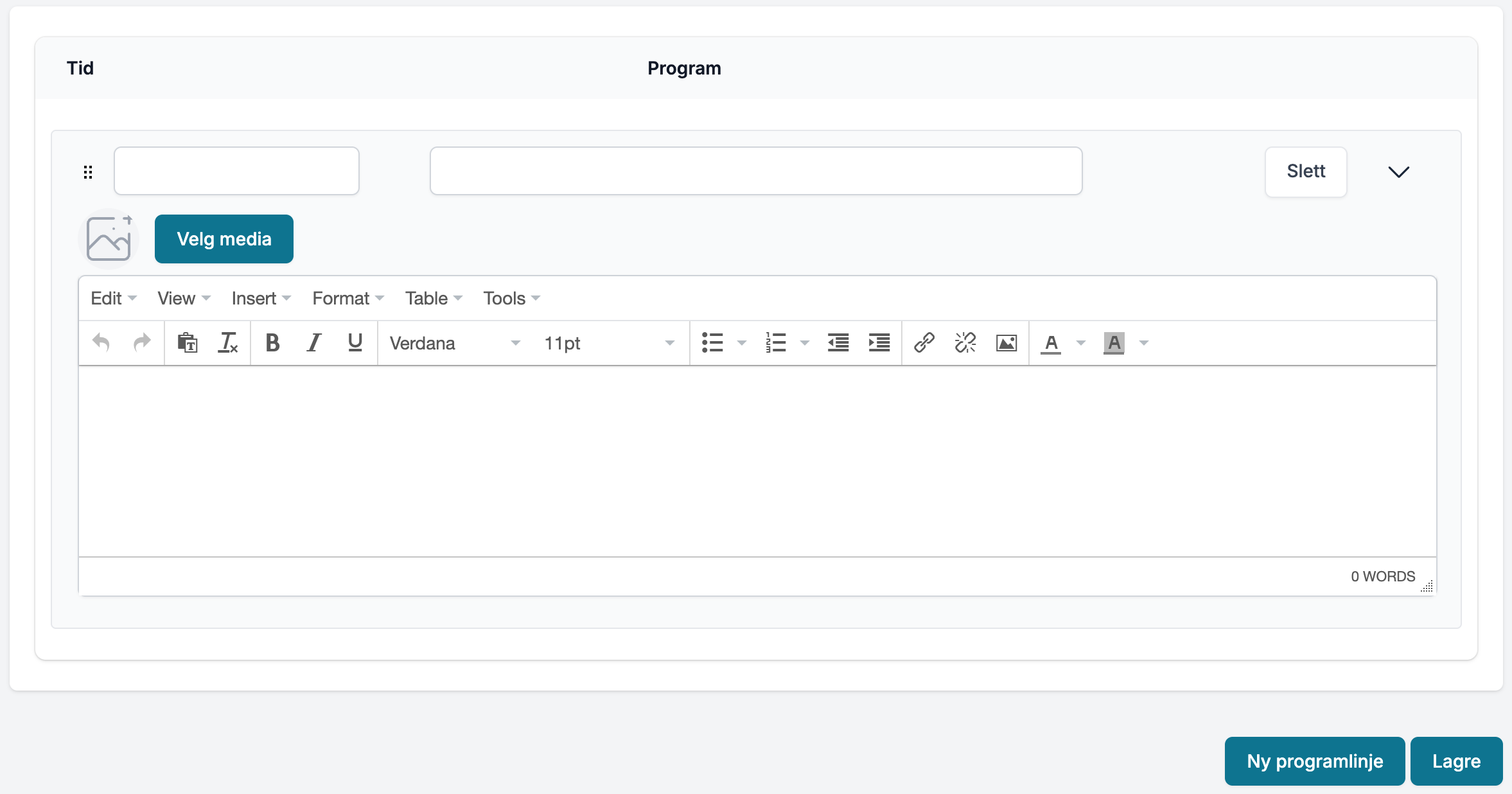 Programlinjene består av tre tekstfelt: Tid, Tittel og et stort beskrivelsesfelt. Trykk på knappen Ny Programlinje for å få fram en ny linje: