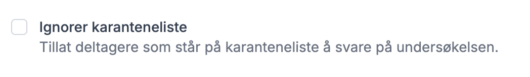 Hvis du skal sende en spørreundersøkelse til deltagere, og du har satt noen på karanteneliste, vil de ikke få lov til å svare. Du kan velge at spørreundersøkelsen skal ignorere karanteneliste, slik at deltagere får svare uansett.