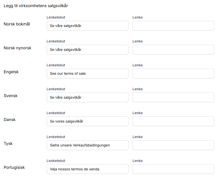 Fra versjon 9 er det mulig å legge til egen link til salgsvilkår som kan vises på alle skjema om man aktiverer feltet for samtykke til salgsvilkår.