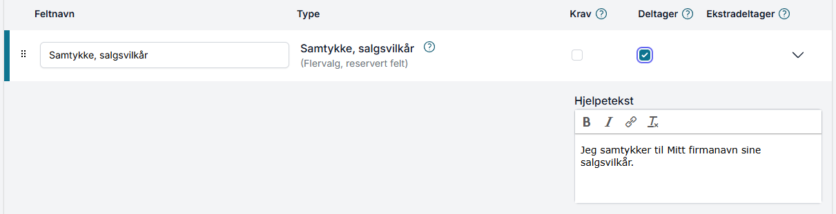 Huk av på "Deltager" og eventuelt "krav" under feltet Samtykke, salgsvilkår: