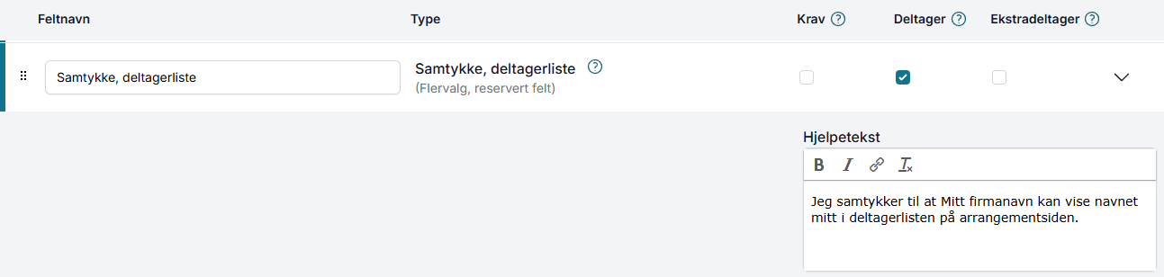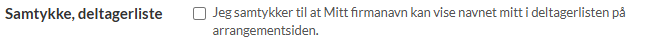 Dette feltet er koblet direkte med siden på aktiviteten som heter Deltagerliste, som kan vises for alle deltagere. Hvis en deltager huker i boksen for å gi sitt samtykke, så vil den vises i listen. Hvis deltageren IKKE huker i boksen, så gir deltageren IKKE sitt samtykke, og vil ikke vises på nettsiden.