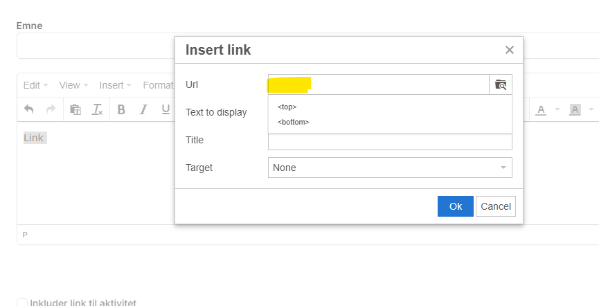 Når man trykker på Insert link (kjetting ikonet), så vises dette bildet: